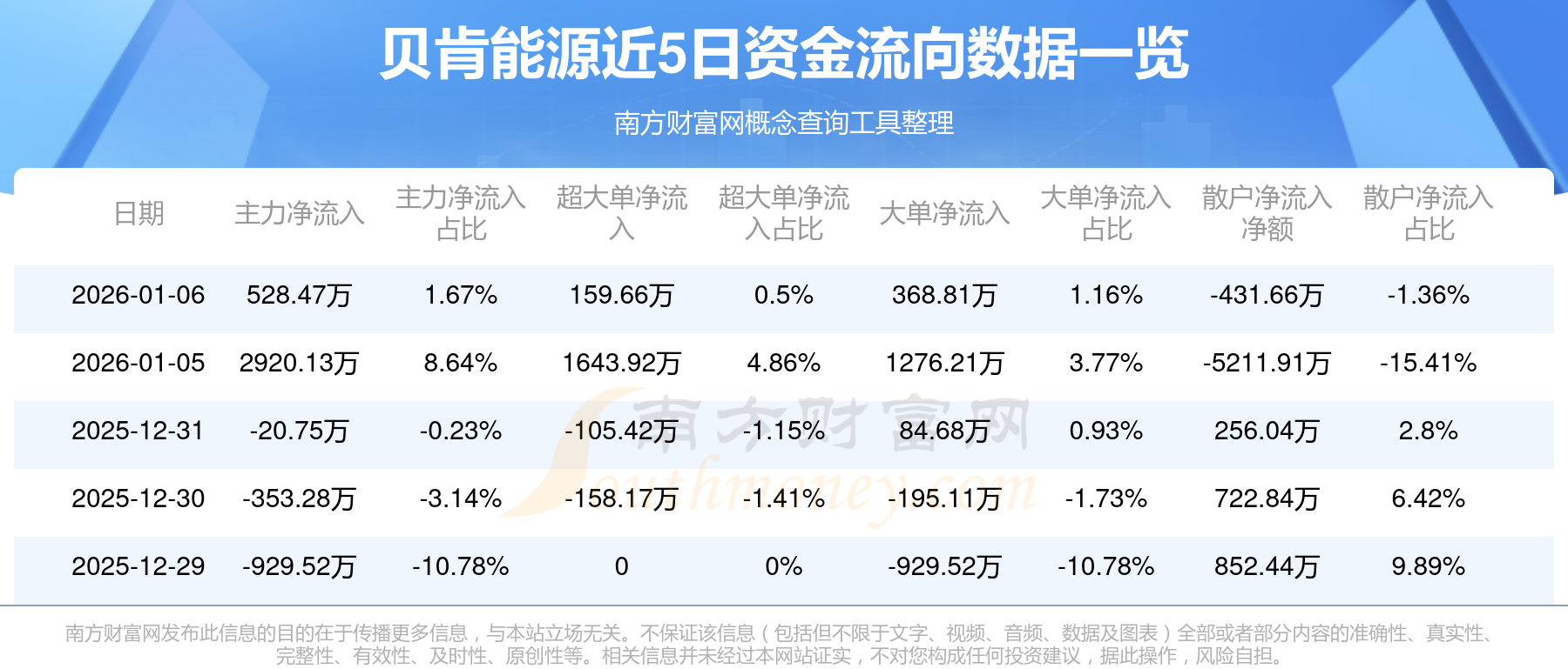1月6日该股主力净入528.47万元,其中资金流入方面:超大单净入572.48万元,大单净入6046.76万元,中单净入1.15亿元,散户净入1.31亿元;资金流出方面:超大单净出412.82万元,大单净出5677.95万元,中单净出1.15亿元,散户净出1.35亿元。