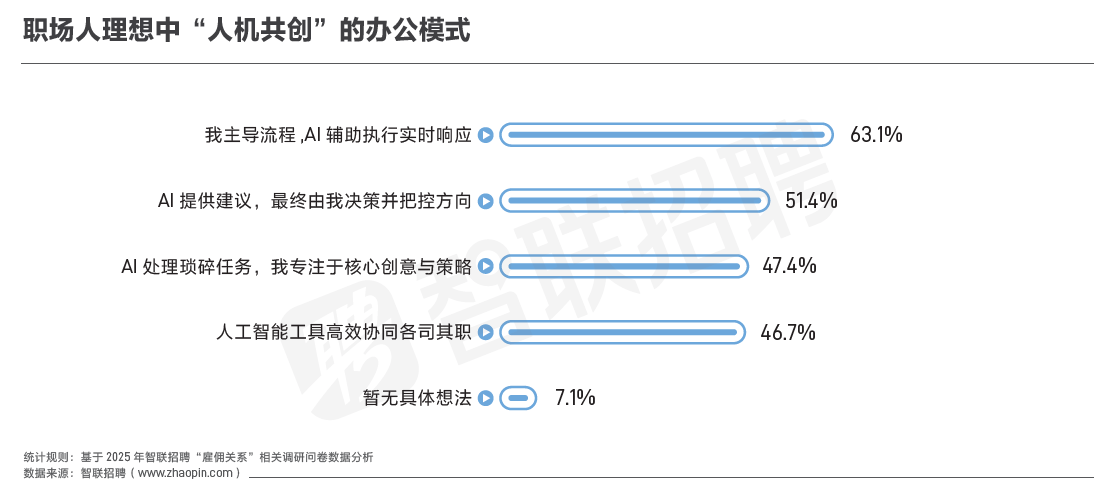 这种改变直接促使工作模式发生结构性变化。职场正逐渐形成一种新的分工模式:人类专注于复杂决策、情感交互与价值创造,而AI承担标准化处理、数据分析和流程优化等相关工作。“人类主导流程,AI辅助执行,实时响应”的人机协作理想模式被超六成(63.1%)职场人所认同,在这种新模式下,职场人的工作目标不再是盲目追求长时间的投入,而是聚焦于高质量的创新和策略输出。