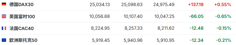 2. 截至发稿,德国DAX指数涨0.55%,英国富时100指数跌0.65%,法国CAC40指数跌0.15%,欧洲斯托克50指数跌0.15%。