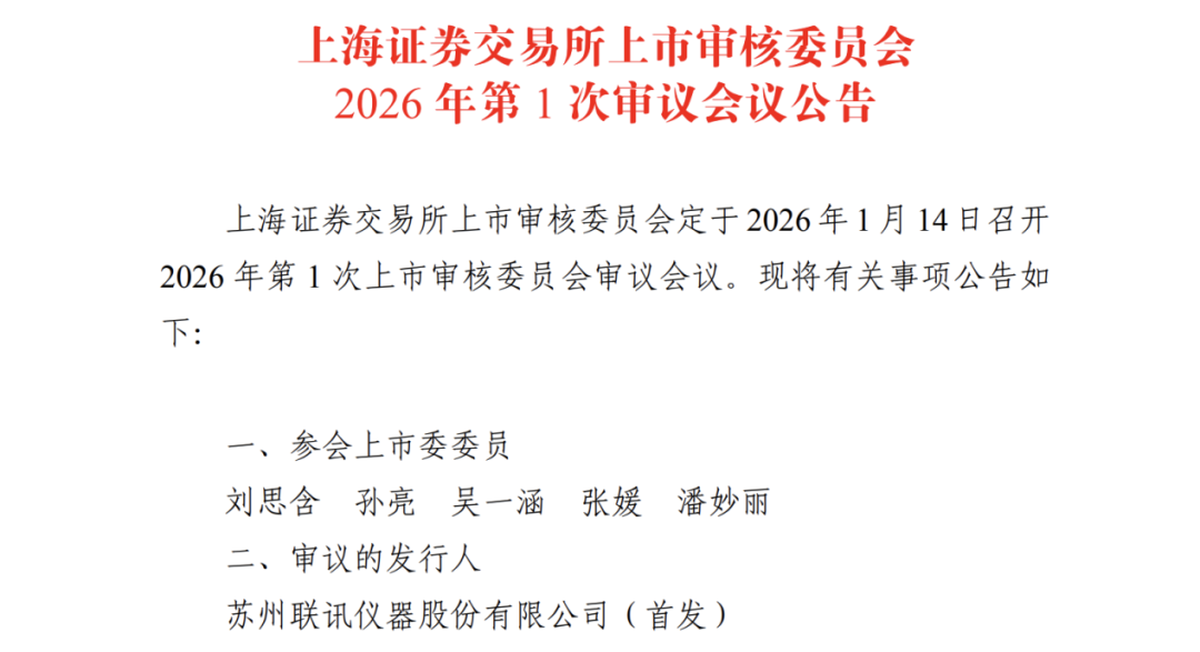 1月7日,上海证券交易所官网公告显示,上海证券交易所上市审核委员会定于1月14日召开2026年第1次上市审核委员会审议会议,审议苏州联讯仪器股份有限公司(简称“联讯仪器”)的首发申请。