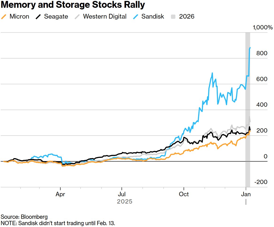 存储芯片制造商是去年标普500指数中表现最佳的板块,因为用于建设人工智能基础设施的海量资金逐渐渗透到科技行业中一些传统上较为沉寂的领域。以闪迪(SNDK.US)、西部数据(WDC.US)、希捷科技(STX.US)和美光科技(MU.US)等公司为首的该板块,在2026年初依然领跑指数。