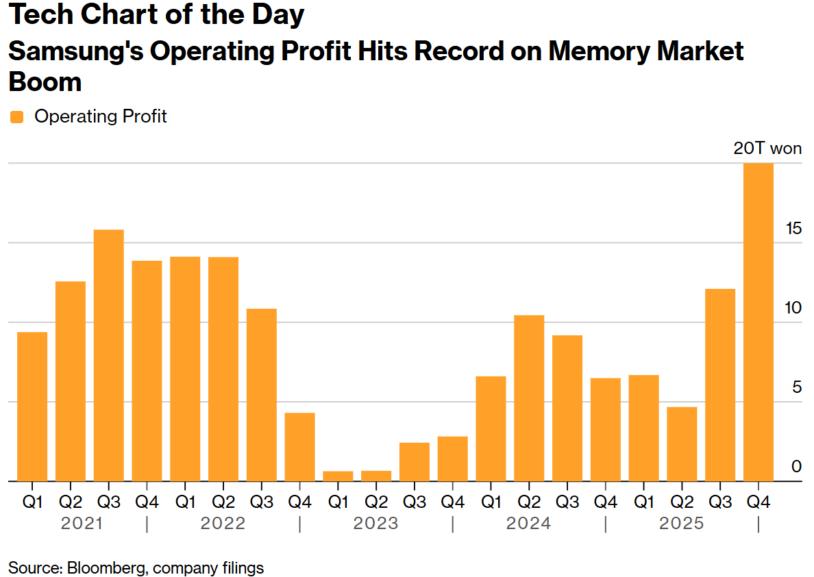 全球人工智能服务器需求激增推高了存储芯片价格,使三星电子的季度利润增长了两倍多,创下历史新高。这家韩国最大的公司报告称,截至12月的三个月初步营业利润为20万亿韩元,同比增长208%,超出分析师平均预期。