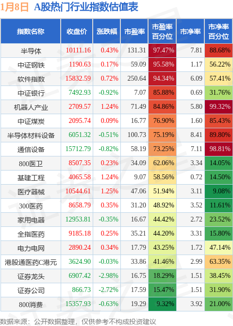 热门行业指数方面,半导体的市盈率百分位较高,为97.47%。而800消费的市盈率百分位较低,为9.32%。