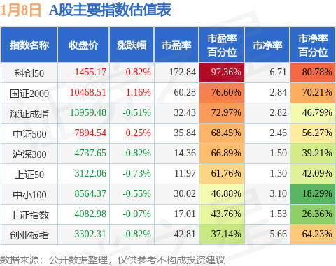 A股主要宽基指数方面,科创50的市盈率百分位较高,为97.36%。而创业板指的市盈率百分位较低,为37.14%。