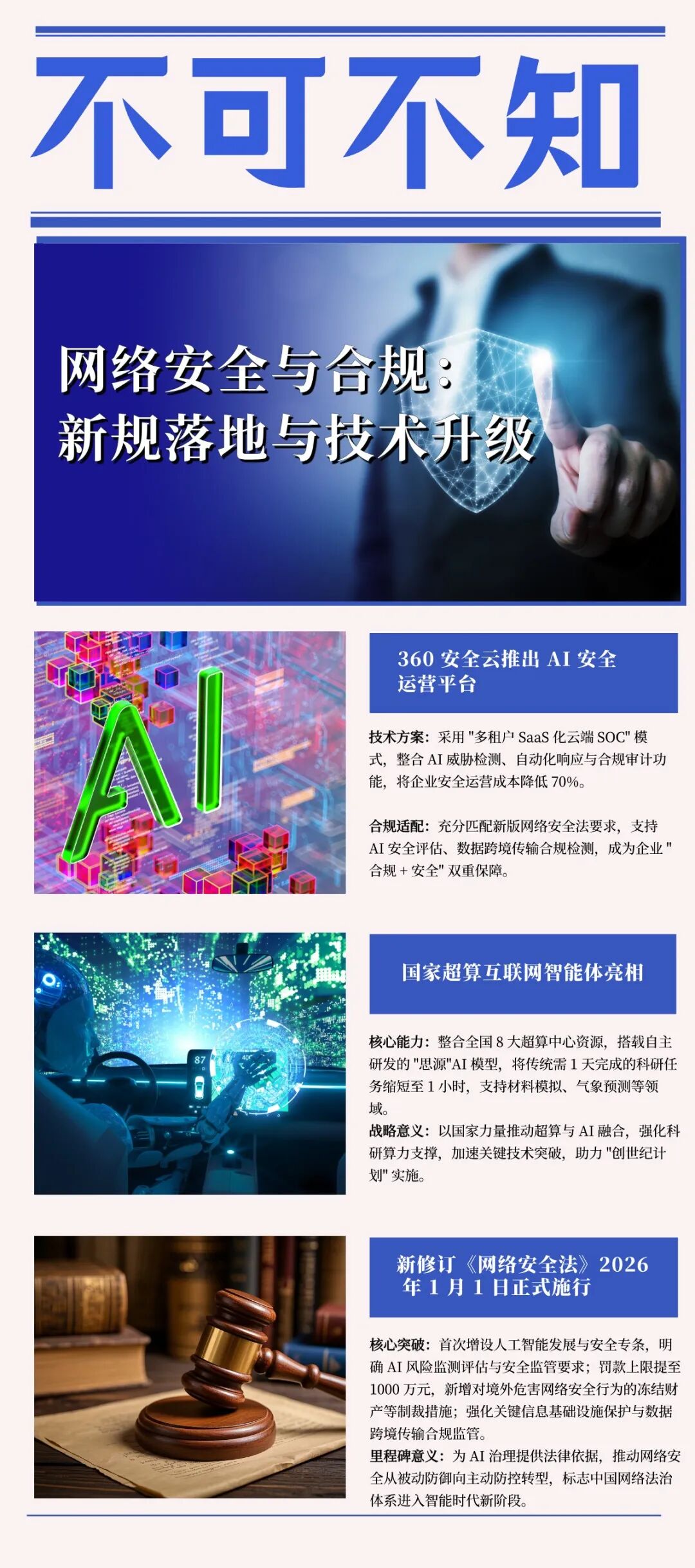 中财投资网(www.161588.com)2026/1/9 17:56:44讯: 2026年初网络安全领域呈现法规升级+技术赋能+强监管落地三大趋势。 新《网络安全法》与AI国家标准构建智能时代法治框架,AI驱动的安全方案实现从被动防御到主动防控转型,国家监管部门加大违规惩戒力度,推动企业将安全合规融入业务全流程。 这些变化共同为数字经济发展筑牢安全屏障,加速AI与实体经济深度融合。 往期回顾 更多信息 01 02 03 04