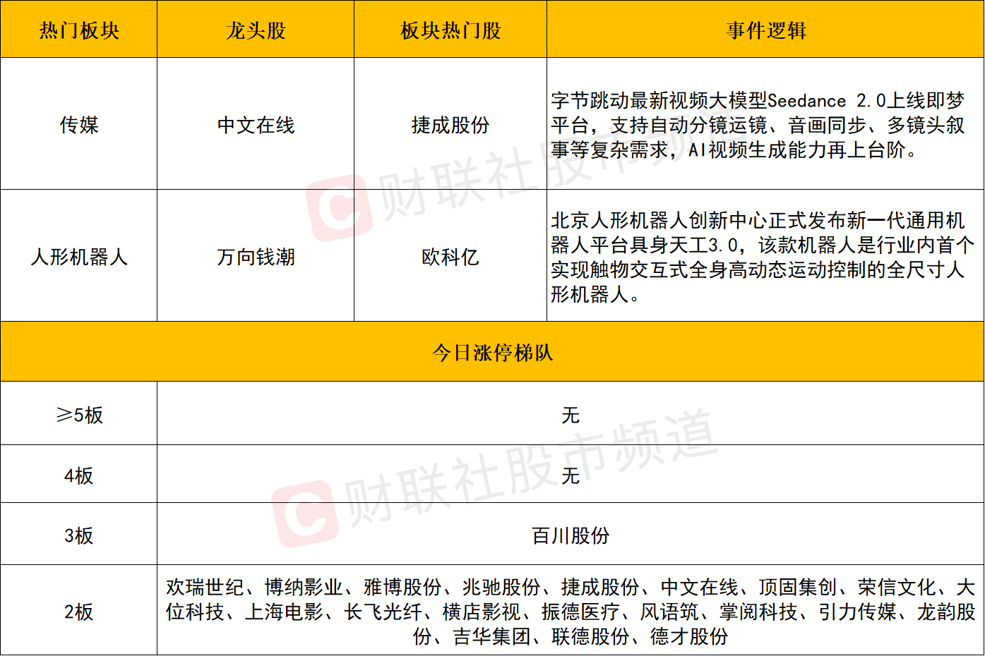 财联社2月10日讯,市场全天窄幅震荡,三大指数涨跌不一,科创50指数涨近1%。沪深两市成交额2.11万亿,较上一个交易日缩量1439亿。盘面上,全市场超3100只个股下跌。从板块来看,传媒板块持续全天领涨,万达电影、读客文化、捷成股份、荣信文化、横店影视、上海电影、博纳影业、中国电影、光线传媒等多股涨停。人形机器人概念表现活跃,万向钱潮涨停。PCB概念震荡拉升,南亚新材、宏和科技双双创历史新高。下跌方面,商业航天概念下挫,顺灏股份触及跌停。大消费板块震荡下跌,杭州解百跌停。截至收盘,沪指涨0.13%,深成指涨0.02%,创业板指跌0.37%。