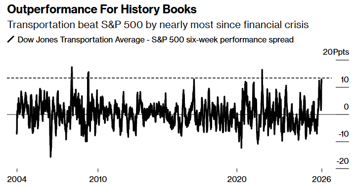 多年来一直落后于美国主要股指的道琼斯运输平均指数如今脱颖而出,在过去一个半月中跑赢标普500指数13个百分点,接近金融危机以来的最大涨幅。该指数包含了CSX运输(CSX.US)、联邦快递(FDX.US)、Old Dominion Freight Line(ODFL.US)以及美联航(UAL.US)等行业巨头,其强劲的经济数据以及对科技巨头的减持趋势推动了该指数的飙升。