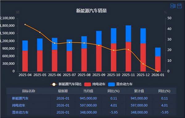 2月11日,中国汽车工业协会发布最新数据显示,2026年1月份,我国汽车行业保持平稳运行。1月,汽车产销分别完成245万辆和234.6万辆,产量同比增长0.01%,销量同比下降3.2%。其中,新能源汽车市场平稳运行,产销分别完成104.1万辆和94.5万辆,同比分别增长2.5%和0.1%。此外,商用车市场延续向好态势,1月份,产销同比均保持两位数增长。1月份,汽车出口方面,继续保持增长。其中,新能源汽车出口保持高速增长,出口30.2万辆,同比增长1倍。