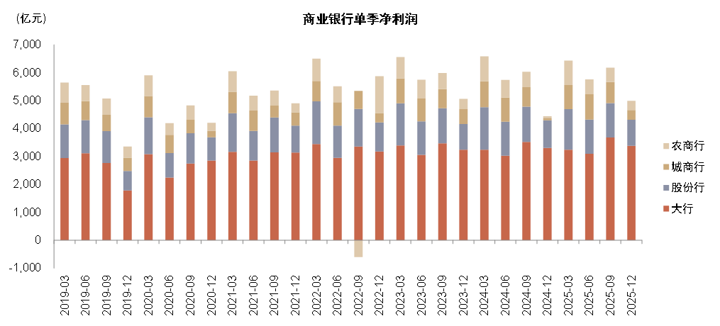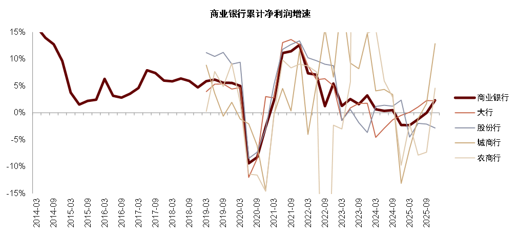 图表:2025年商业银行净利润同比+2%,4Q25单季同比+12%,增速较快主要来自城农商行