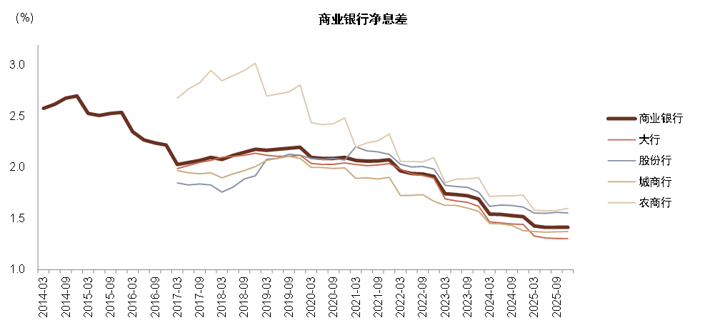 净息差环比保持基本稳定,同比降幅收窄。2025商业银行净息差1.42%,较前三季度的1.42%基本稳定,同比降幅收窄至11bp,我们认为主要由于资产端利率下行有限而存款重定价带动负债成本下行。分银行类型看,大行息差降幅相对中小行更大,主要由于大行服务的优质客群议价能力更强、定期存款占比相对较低。考虑到存款重定价仍在继续,我们预计2026年商业银行息差降幅会较25年进一步收窄至个位数,叠加一定水平的资产规模扩张,净利息收入增速或加快至接近5%。
