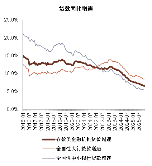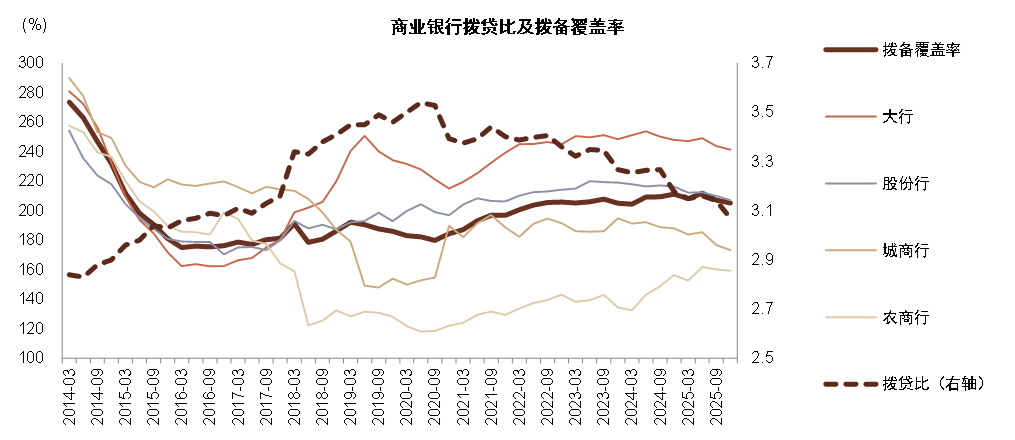 存款增长推动资产增速维持较高水平。2025年末商业银行总资产同比+9.0%至415万亿元,增速较此前略有加快,由存款增长推动,2025年末存款类金融机构存款同比+8.8%至330万亿元。而贷款增速仍有放缓,2025年末存款类金融机构贷款同比增长6.5%至273万亿元。分银行类型看,仍是大行和城商行资产扩张速度较快。我们预计上述特征在2026年或继续呈现,即资产和信贷维持一定增速,增速或略有放缓,分结构看大行和城商行增速较快,其他银行偏弱。