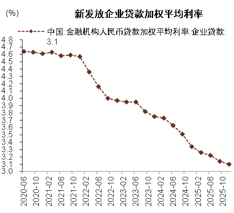 图表:2025年12月企业贷款新发放利率较9月下降4bp至3.10%