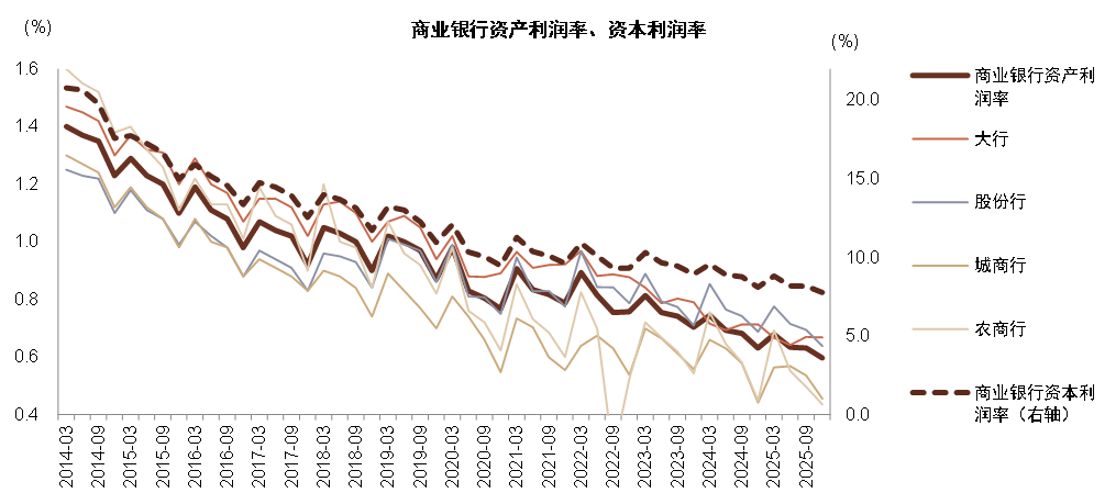 图表:2025年商业银行资产利润率同比-3bp至0.60%,资本利润率同比-33bp至7.8%