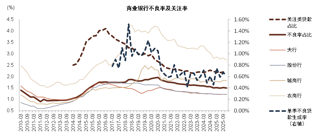 图表:2025年末商业银行不良率环比下降2bp至1.50%、关注率环比下降2bp至2.18%,基本稳定;我们估算4Q25单季加回核销后的不良生成率环比下降6bp、同比上升16bp至0.61%