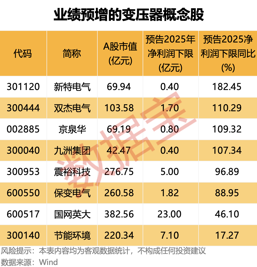 从已披露的业绩预告数据来看,按照业绩预告净利润下限计算(若无下限则取公告数值),8只变压器概念股2025年净利润有望同比增长(含扭亏为盈),包括新特电气(301120)、双杰电气、京泉华)