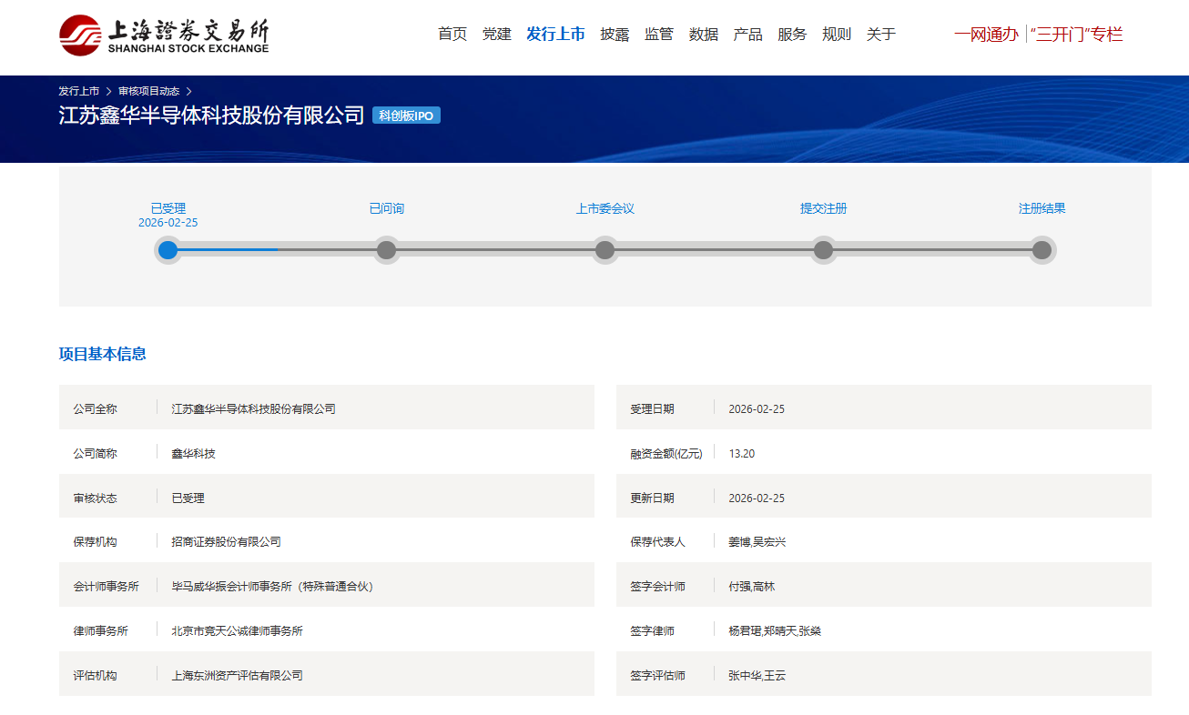 2月25日,上交所官网信息显示,江苏鑫华半导体科技股份有限公司(简称“鑫华科技”)科创板IPO申请获得上交所受理,这是马年首单获得受理的IPO项目。