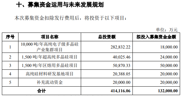 招股书显示,鑫华科技拟募资13.2亿元,用于10000吨/年高纯电子级多晶硅产业集群项目、1500吨/年超高纯多晶硅项目、1500吨/年区熔用多晶硅项目、高纯硅材料研发基地项目、补充流动资金等。