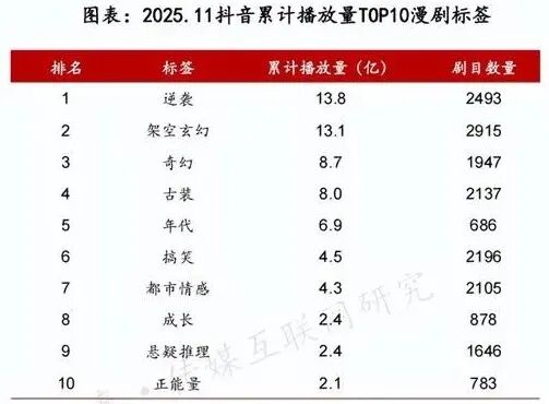 与短剧相比,两者有很多相似之处。从内容来看,短剧与漫剧都脱胎于网文逻辑,主打“黄金三秒”和“密集爽点”叙事。从商业模式来看,漫剧也与短剧高度重合。它们同样扎根于抖音、快手、微信小程序等短视频为主的内容平台,分发、消费和变现都深度依赖平台的推荐算法和用户碎片化习惯。