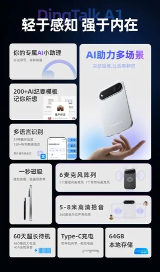 钉钉 DingTalk A1:重塑全场景销售沟通的“软硬一体”方案钉钉 DingTalk A1 是钉钉首款 AI 硬件,集录音笔、翻译机、会议机、AI 助理于一体,定位为“办公小助理”,秉持“轻于感知、强于内在”的设计理念。其核心在于通过“软硬一体”设计,将销售对话实时转化为可行动的商机数据。该产品依托通义开源大模型生态,已服务 7 亿用户,世界 500 强企业中 80% 均有使用,并获得央视在第四届全球数字贸易博览会上的推荐,被称为“可感可知”的 AI 黑科技。