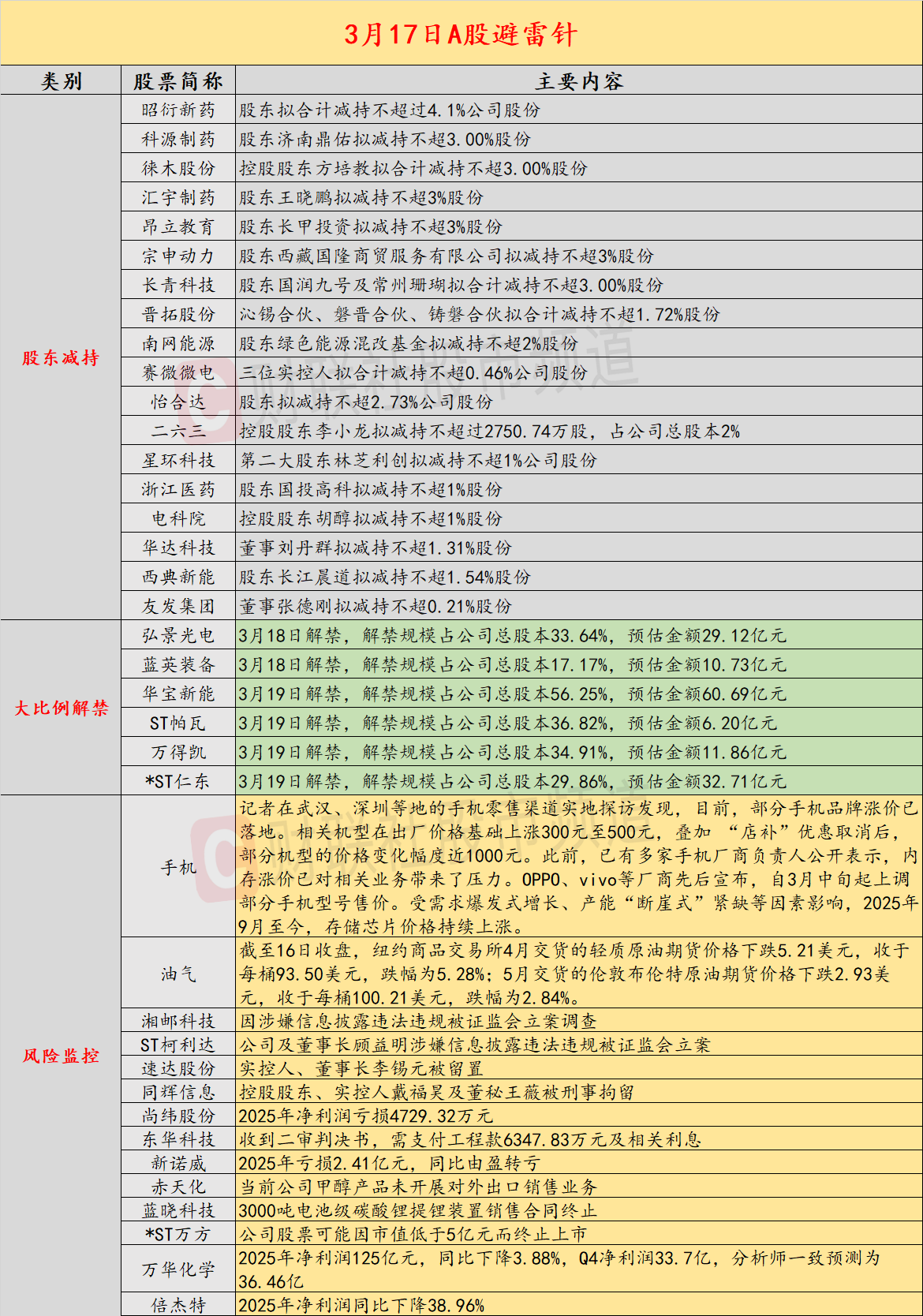 导读:财联社3月17日投资避雷针,近日A股及海外市场潜在风险事件如下。国内经济信息方面包括:1)成本与需求双重挤压,3月手机面板价格延续跌势;2)多家手机厂商宣布调价,部分机型价格上涨近千元;公司方面重点关注包括:1)湘邮科技因涉嫌信息披露违法违规被证监会立案调查;2)速达股份实控人、董事长李锡元被留置;海外市场重点关注包括:1)特朗普暗示袭击哈尔克岛石油设施;2)国际油价16日大幅下跌。