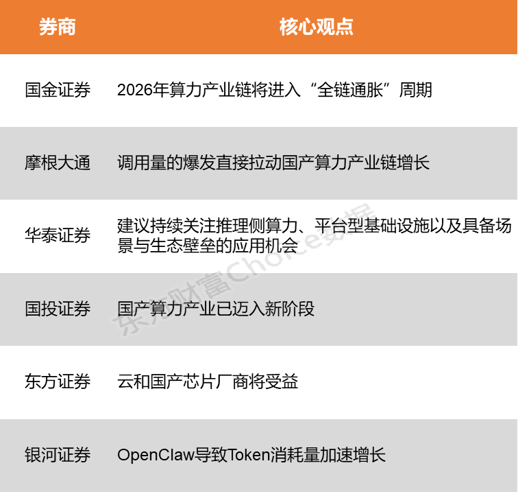 国金证券表示,在供需双侧强逻辑的挤压下,预判2026年算力产业链将进入“全链通胀”周期,行业景气度将从核心芯片向AIDC、云与算力服务、配套电力设备及服务器等环节全面外溢。摩根大通指出,调用量的爆发直接拉动国产算力产业链增长。从AI芯片、服务器到数据中心、云计算,均迎来业绩爆发期。 500)this.width=500 align=center hspace=10 vspace=10 alt=> 国金证券:2026年算力产业链将进入“全链通胀”周期