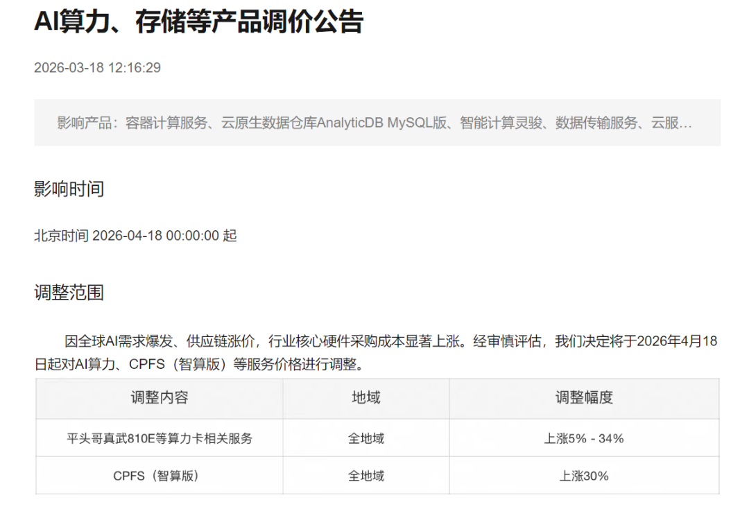 3月18日,阿里云发布公告称,因全球AI需求爆发、供应链涨价,行业核心硬件采购成本显著上涨,阿里云决定上调AI算力、CPFS(智算版)价格,其中平头哥真武810E等算力卡产品价格上涨5%—34%、文件存储CPFS(智算版)上涨30%。