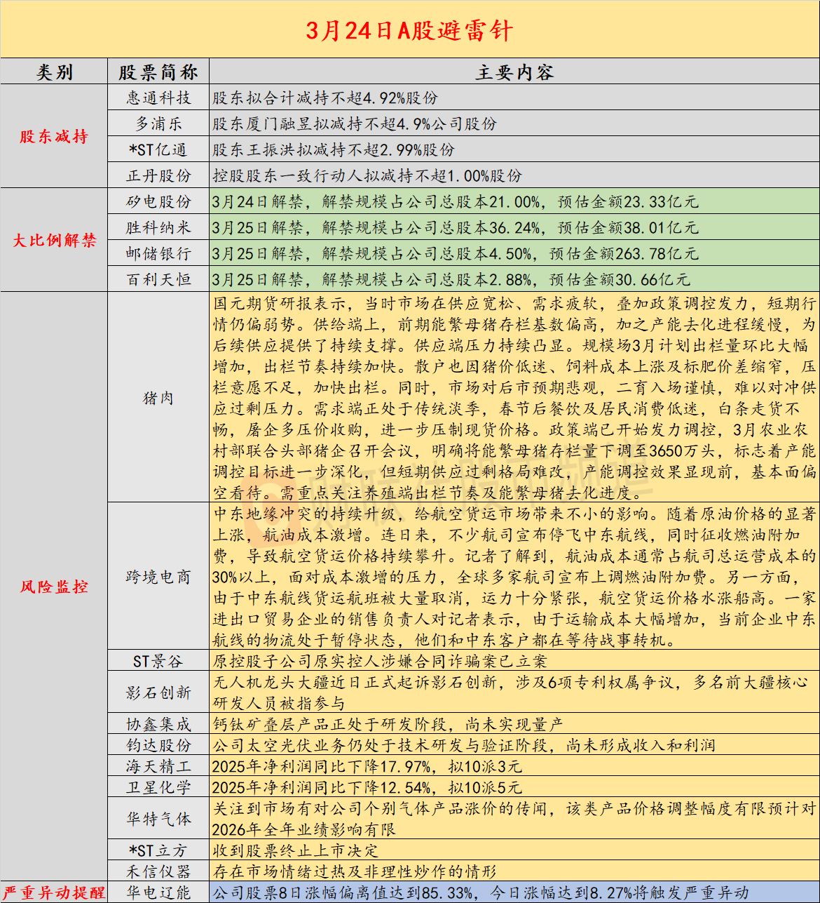 导读:财联社3月24日投资避雷针,近日A股及海外市场潜在风险事件如下。国内经济信息方面包括:1)供需矛盾持续释放,猪价承压运行;2)空运价格暴涨,中东跨境卖家生意停摆;公司方面重点关注包括:1)ST景谷原控股子公司原实控人涉嫌合同诈骗案已立案;2)无人机龙头大疆近日正式起诉影石创新,涉及6项专利权属争议,多名前大疆核心研发人员被指参与;海外市场重点关注包括:1)美油、布油收跌超10%;2)特朗普称美伊或在5天内达成协议,但伊朗高级领导层否认与美国进行了谈判。