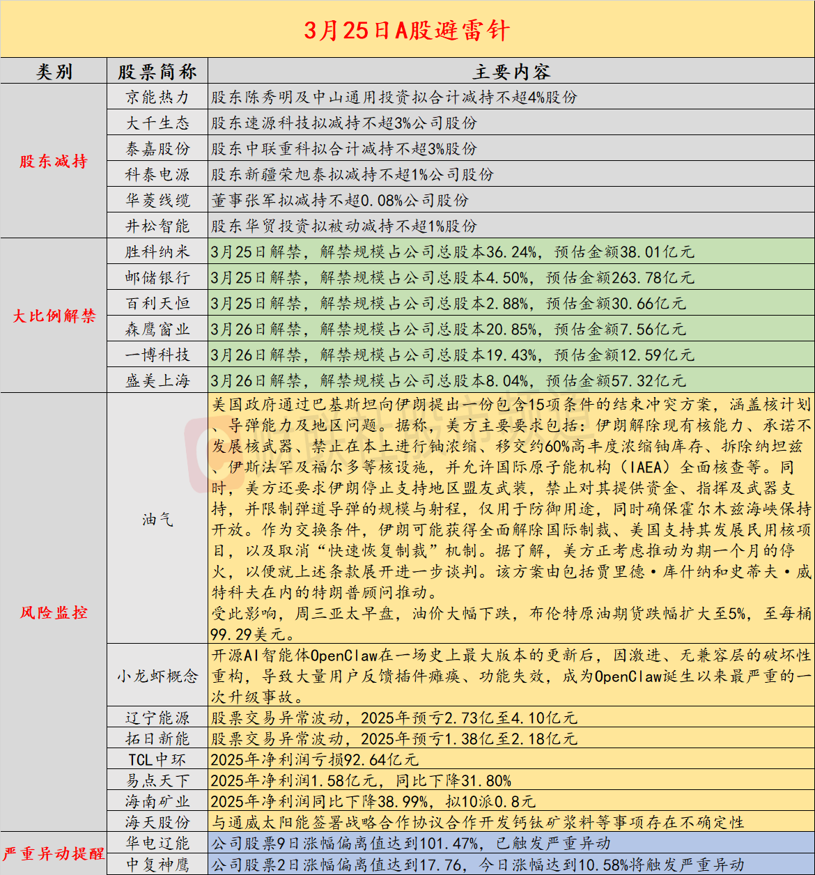 导读:财联社3月25日投资避雷针,近日A股及海外市场潜在风险事件如下。国内经济信息方面包括:1)地缘缓和预期释放,原油期货大幅回落调整;2)硅片价格重心窄幅下移;公司方面重点关注包括:1)2连板辽宁能源公告,股票交易异常波动,2025年预亏2.73亿至4.10亿元;2)2连板拓日新能公告,股票交易异常波动,2025年预亏1.38亿至2.18亿元;海外市场重点关注包括:1)美方向伊朗提出含“15项条件”的和谈方案,周三亚太早盘油价大幅下跌;2)OpenClaw重大升级遇挫,激进重构致用户全线报错。