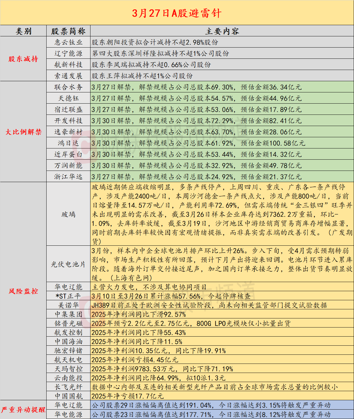 导读:财联社3月27日投资避雷针,近日A股及海外市场潜在风险事件如下。国内经济信息方面包括:1)玻璃供需双弱,库存较高;2)4月电池片排产预计下降,出货节奏明显放缓;公司方面重点关注包括:1)9天8板华电辽能公告,主营火力发电,不涉及算电协同项目;2)12天10板*ST正平3月10日至3月26日累计涨幅57.56%,今起停牌核查;海外市场重点关注包括:1)美股纳指收跌2.4%,多只AI明星股遭重挫,闪迪跌超11%,Meta跌近8%,英伟达跌超4%;2)谷歌推出压缩算法TurboQuant,宣称实现约6倍内存节省,美股存储板块连日大跌。