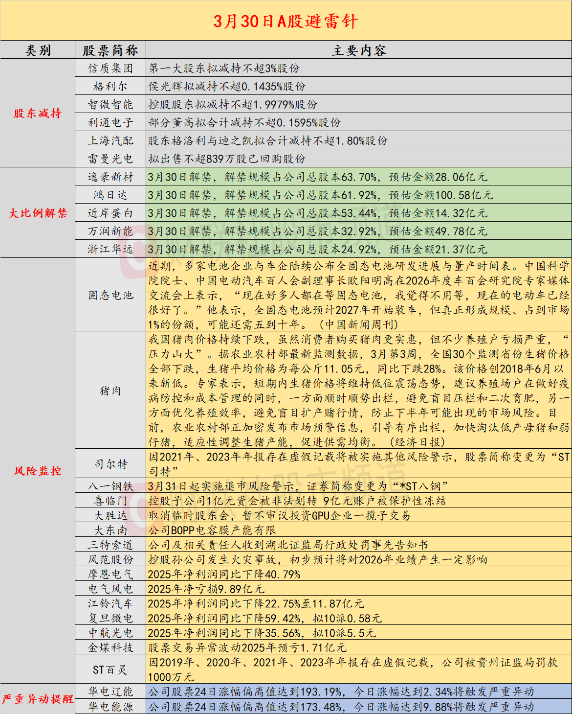 导读:财联社3月30日投资避雷针,近日A股及海外市场潜在风险事件如下。国内经济信息方面包括:1)中国科学院院士称,全固态电池或至少再等5年;2)全国猪价跌破5元,创历史新低;公司方面重点关注包括:1)司尔特因2021年、2023年年报存在虚假记载将被实施其他风险警示,股票简称变更为“ST司特”;2)八一钢铁3月31日起实施退市风险警示,证券简称变更为“*ST八钢”;海外市场重点关注包括:1)上周五美股纳指收盘大跌超2%,标普500指数录得周线五连跌;2)美军备战伊朗地面行动的消息引爆全球。