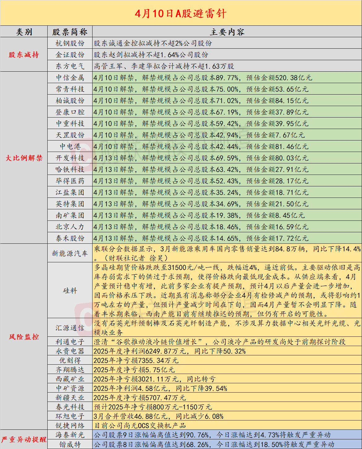 导读:财联社4月10日投资避雷针,近日A股及海外市场潜在风险事件如下。国内经济信息方面包括:1)3月新能源乘用车国内零售销量达到84.8万辆,同比下降14.4%;2)供过于求,多晶硅期货逼近前低;公司方面重点关注包括:1)5连板汇源通信公告,没有石英光纤预制棒及石英光纤制造产能,不涉及算力数据中心相关光纤光缆、光模块业务;2)利通电子澄清“谷歌推动液冷链价值增长”,公司液冷产品的研发尚处于前期探讨阶段;海外市场重点关注包括:1)消息人士称伊朗在黎巴嫩实现停火前不会与美国和谈;2)俄媒报道,伊朗每天允许不超过15艘船只通过霍尔木兹海峡。