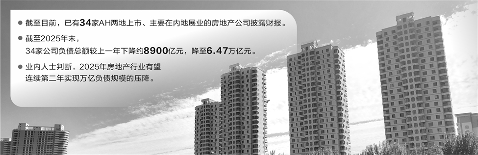 截至目前,已有34家AH两地上市、主要在内地展业的房地产公司披露财报。据Wind统计,34家公司截至2025年末负债总额较上一年下降约8900亿元,降至6.47万亿元。随着年报继续披露,业内人士判断,2025年房地产行业有望连续第二年实现万亿负债规模的压降。