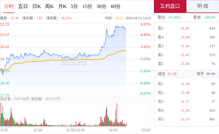 交易所数据显示,4月13日,特发信息开盘后短暂冲高,随后快速回落探底,企稳后整体呈现震荡上行的走势,午后盘中进一步放量拉升,大部分时间在均价线上方运行,整体走势偏强。