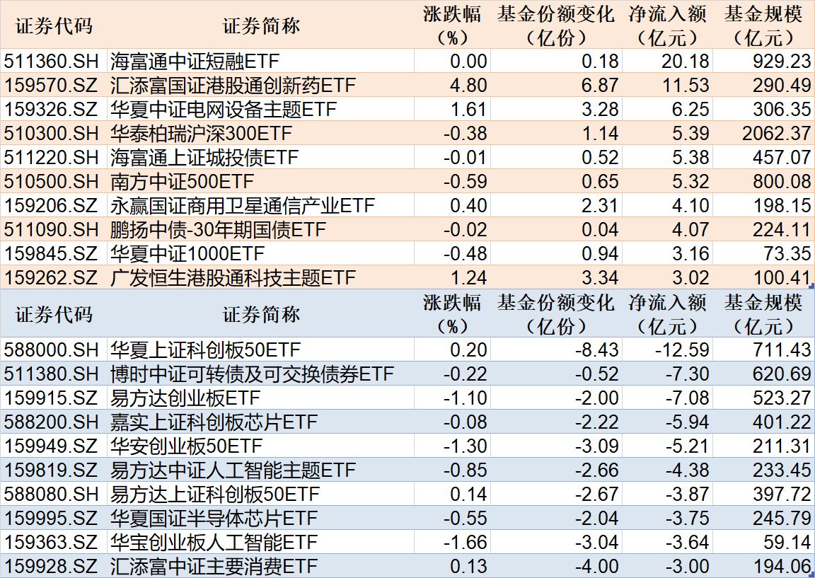 与此同时,华夏上证科创板50ETF基金份额减少8.43亿份,净流出额12.59亿元;博时中证可转债及可交换债券ETF基金份额减少0.52亿份,净流出额7.30亿元;易方达创业板ETF基金份额减少2.00亿份,净流出额7.08亿元。