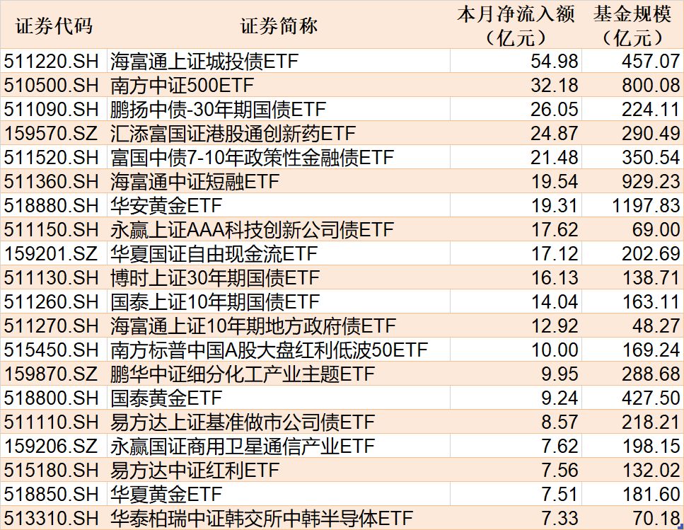 截至4月15日,本月资金净流入额居前20的ETF名单如下: