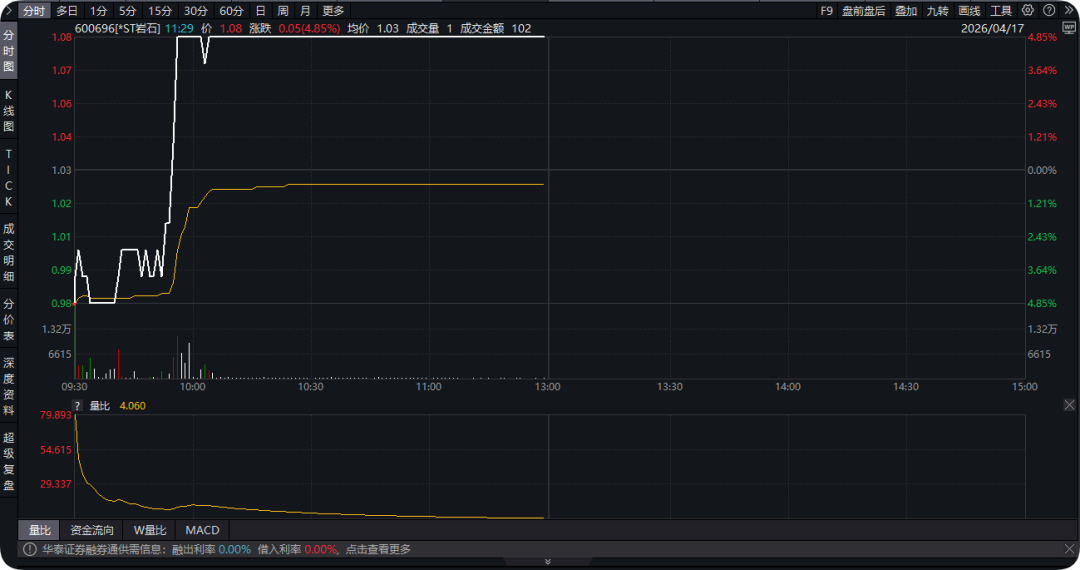4月17日早盘,*ST岩石(600696)开盘跌停,股价最低报0.98元/股,为历史首次低于1元,开盘不到半小时,个股迅速打开跌停板,直线拉升至涨停,直至午间休市,仍有1.28万手买单封死涨停板,封单资金达到1.7亿元。