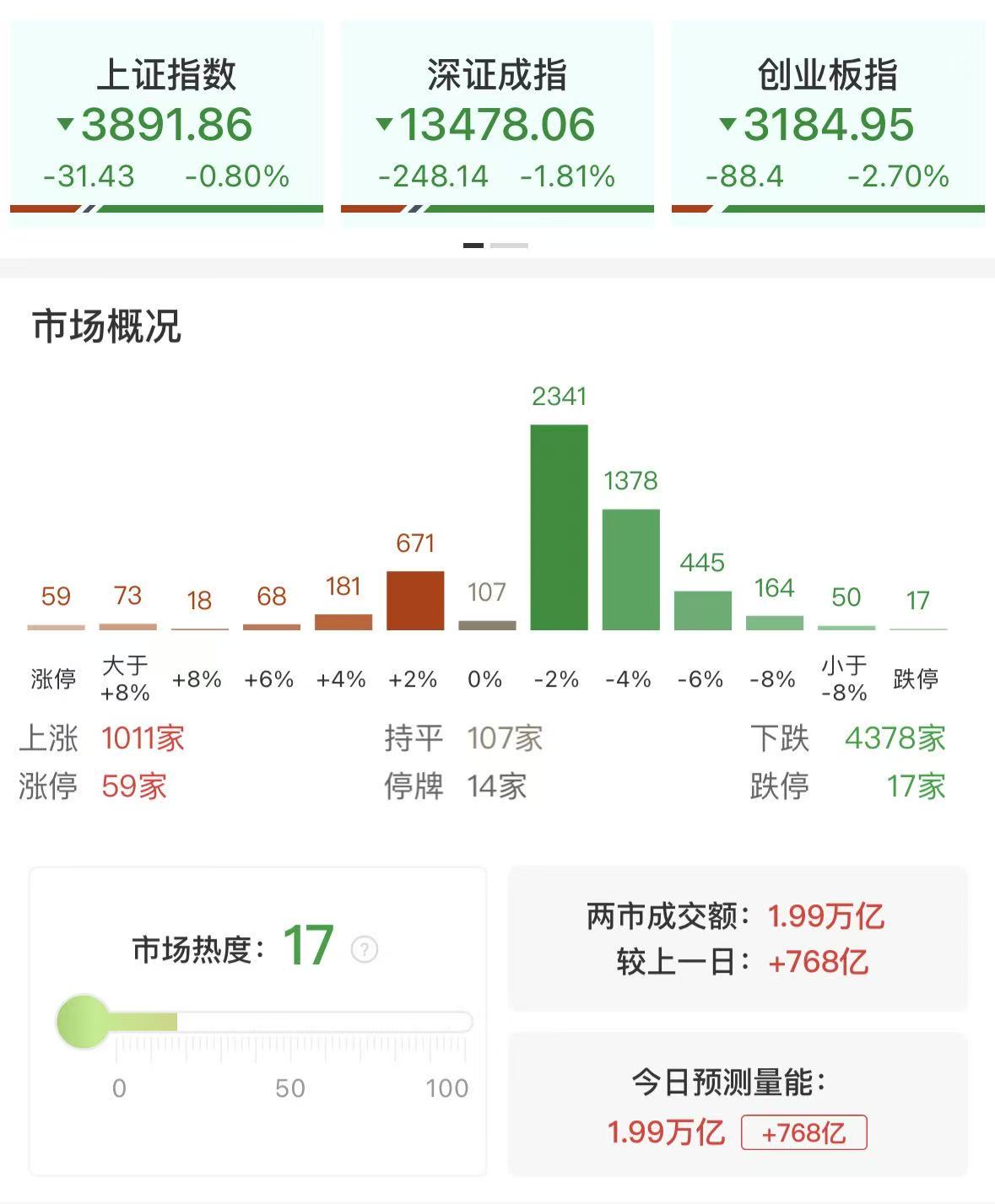 财联社3月31日讯,市场震荡走低,三大指数集体收跌,创业板指与科创50双双跌超2%。沪深两市全天成交额1.99万亿,较上个交易日放量768亿。盘面上热点较为杂乱,全市场近4400只个股下跌。从板块来看,高铁概念延续强势,神州高铁2连板,金鹰重工20CM涨停。商业航天概念逆势走强,神剑股份走出4连板。创新药方向反复活跃,津药药业、凯莱英等涨停。下跌方面,存储芯片概念集体下挫,佰维存储、德明利、香农芯创大跌。截至收盘,沪指跌0.8%,深成指跌1.81%,创业板指跌2.7%。