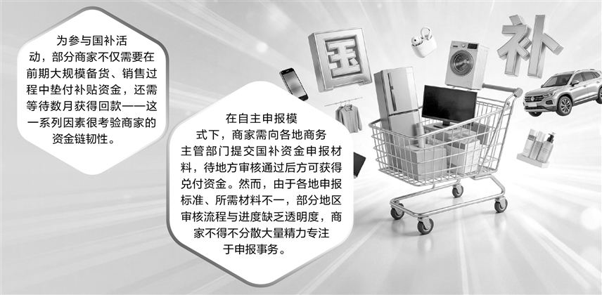新一轮消费品以旧换新政策实施以来,参与国补活动的商家在切实享受政策红利的同时,也遭遇了困扰——在“先垫资、后申领”的模式下,商家不仅面临资金垫付压力,还需要在申领补贴环节投入大量人力和时间成本。“回款周期长尚可应对,但回款周期的不确定性才是最大的麻烦。”王浩说。