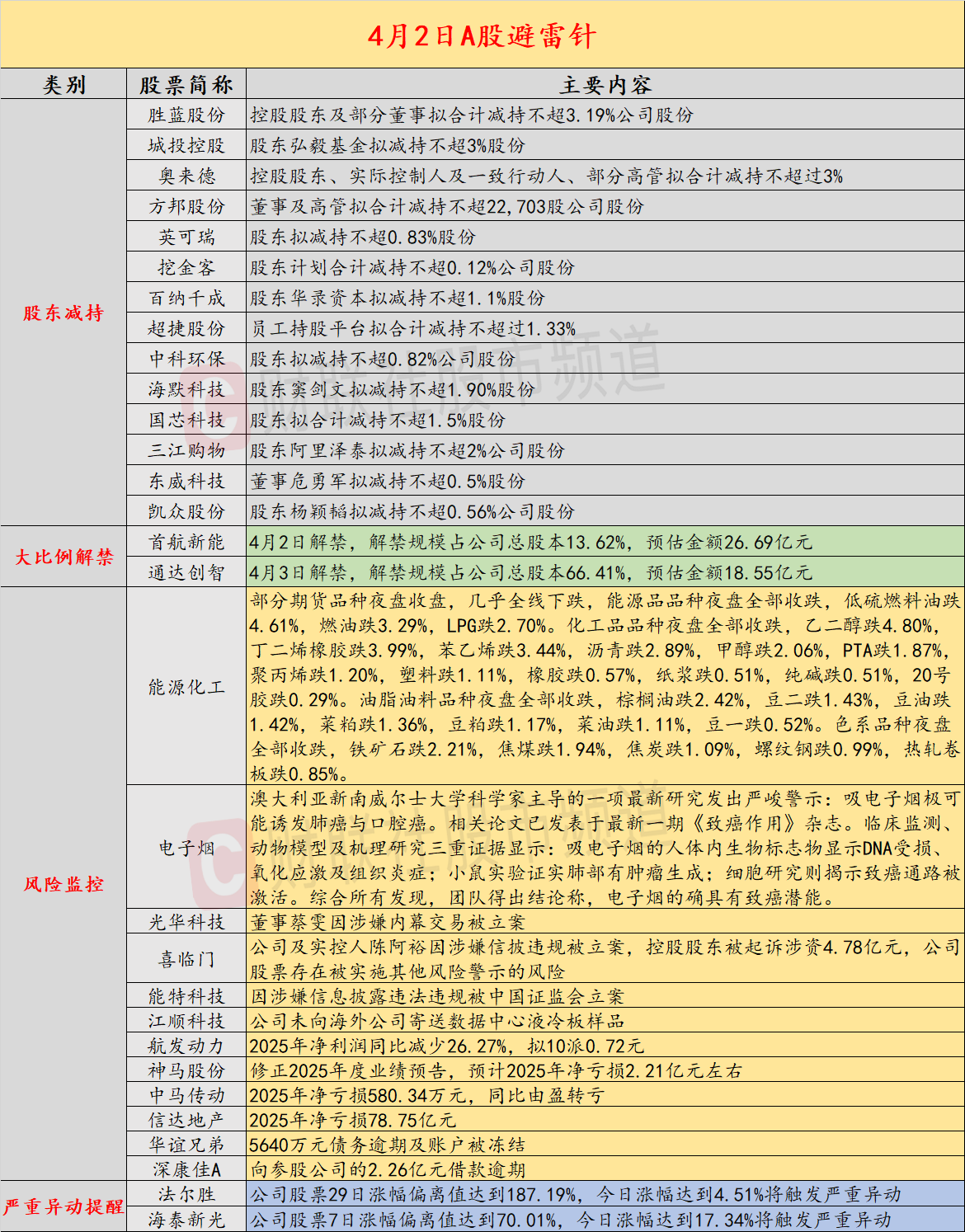 导读:财联社4月2日投资避雷针,近日A股及海外市场潜在风险事件如下。国内经济信息方面包括:1)期货夜盘收盘,几乎全线下跌;2)手机回收价出现下跌,旧手机回收价一周跌百元;公司方面重点关注包括:1)能特科技因涉嫌信息披露违法违规被中国证监会立案;2)喜临门公司及实控人陈阿裕因涉嫌信披违规被立案,控股股东被起诉涉资4.78亿元,公司股票存在被实施其他风险警示的风险;海外市场重点关注包括:1)消息人士称伊朗要求停火谈判必须以永久结束战争为前提;2)美财政部预计油价将在一段时间内维持在100美元/桶上方。