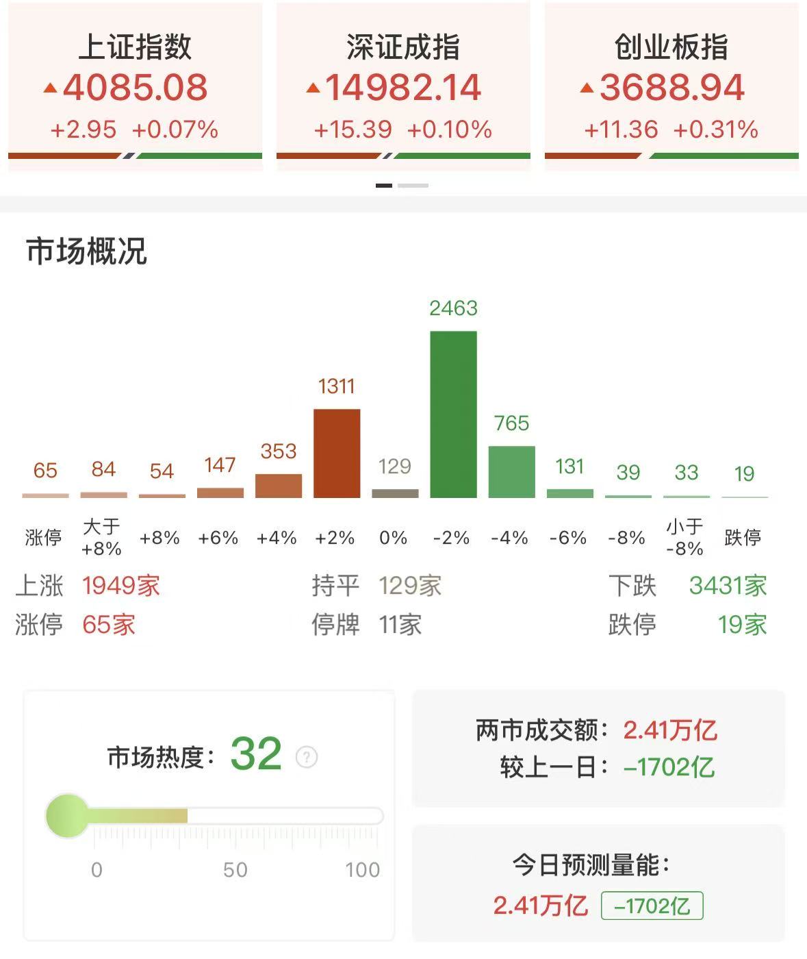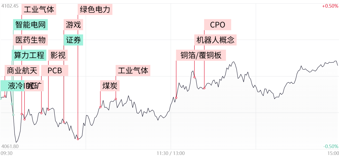 财联社4月21日讯,市场探底回升,三大指数集体收红,创业板指此前一度跌超1.5%。沪深两市成交额2.41万亿,较上一个交易日缩量1702亿。盘面上,市场热点较为杂乱,全市场超3400只个股下跌。从板块来看,绿电概念走强,粤电力A、浙江新能、华电辽能涨停。商业航天概念延续强势,中衡设计2连板,顺灏股份T字涨停,神剑股份走出5天3板,续创历史新高。工业气体概念持续拉升,华特气体20CM涨停,广钢气体、金宏气体涨超10%。影视院线概念表现活跃,北京文化、文投控股双双涨停。下跌方面,液冷服务器概念集体走弱,英维克跌停,佳力图、大元泵业、川润股份等纷纷下挫。截至收盘,沪指涨0.07%,深成指涨0.1%,创业板指涨0.31%。