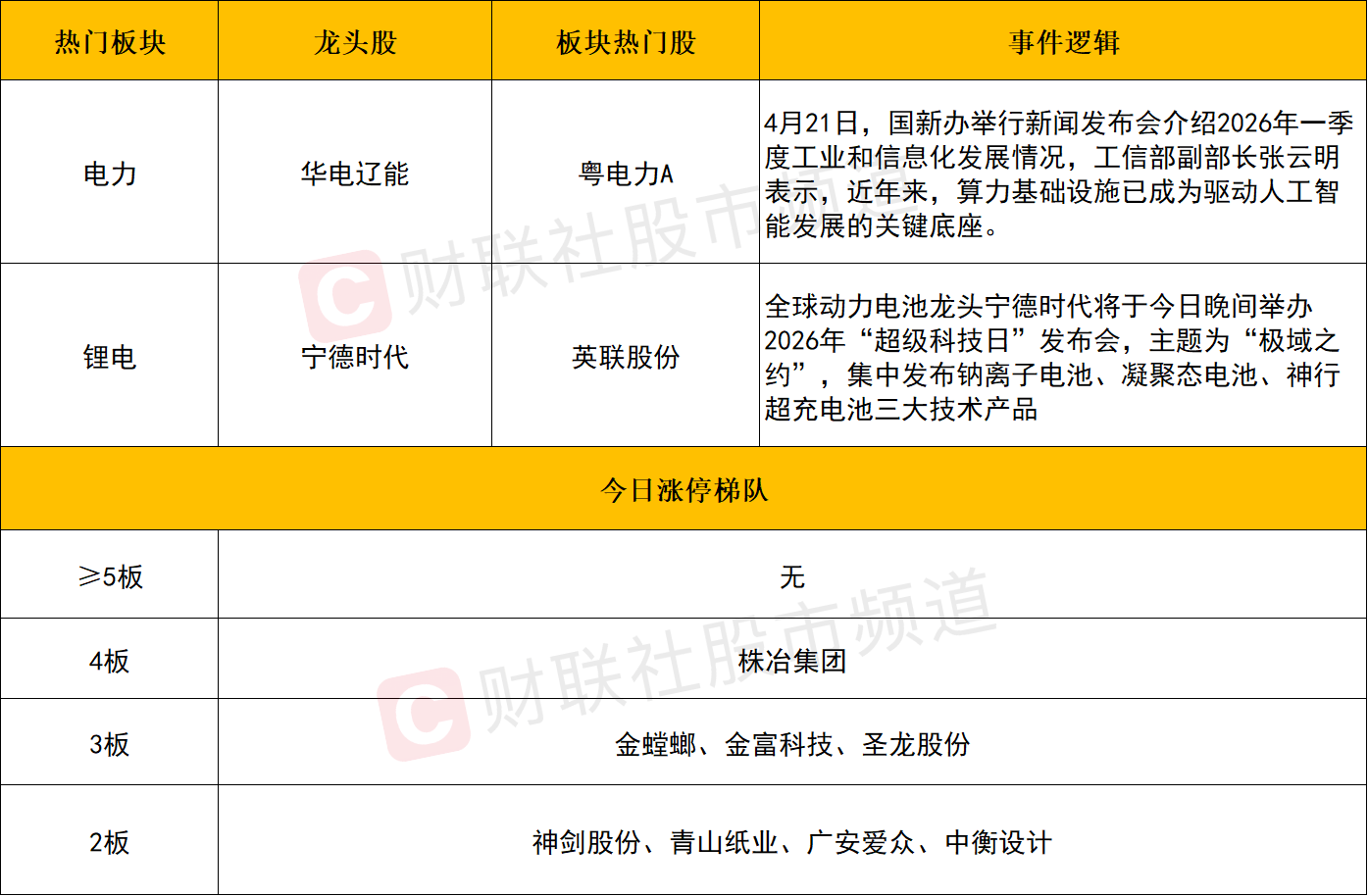 电力概念走强,粤电力A、浙江新能、华电辽能涨停,晋控电力、乐山电力、通宝能源等个股涨幅居前。消息面上,4月21日,国新办举行新闻发布会介绍2026年一季度工业和信息化发展情况,工信部副部长张云明表示,近年来,算力基础设施已成为驱动人工智能发展的关键底座。目前工信部正在开展算电协同政策研究和标准制定。