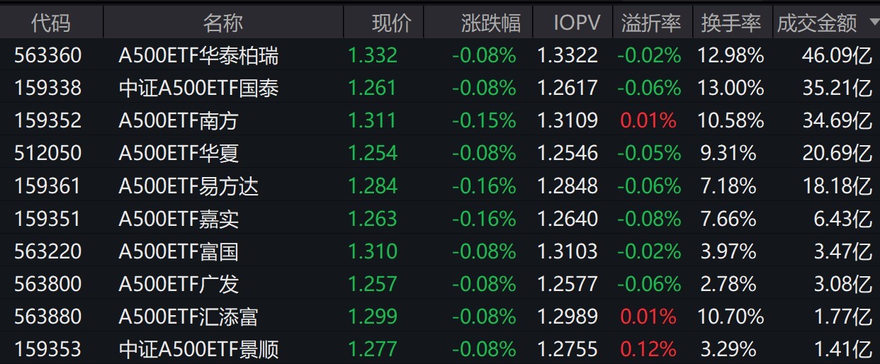 截至上午收盘,场内跟踪中证A500指数的ETF小幅下跌。其中,有10只中证A500相关ETF成交额超1亿元,2只超35亿元。A500ETF华泰柏瑞、中证A500ETF国泰早盘成交额分别为46.09亿元、35.21亿元。