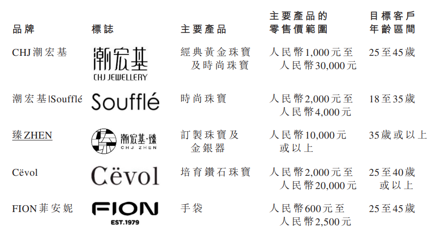 公司表示,旗下以CHJ潮宏基、潮宏基|Souffl、臻ZHEN、Cevol等珠宝品牌提供珠宝首饰产品,以及以FION菲安妮品牌提供手袋。其中CHJ潮宏基主打经典黄金珠宝及时尚珠宝、潮宏基|Souffl专营时尚珠宝、臻ZHEN提供订制珠宝及金银器、Cevol提供培育钻石珠宝。