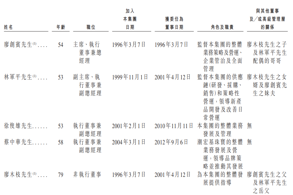 上市申请书中的高管介绍显示,潮宏基的核心人物大多来自廖氏家族。