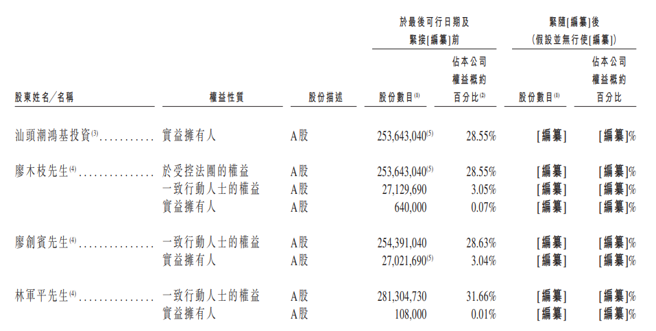 潮鸿基的大股东汕头潮鸿基投资持有28.55%的股份,而汕头潮鸿基投资分别由廖木枝、林军平、廖创宾最终拥有约51.6%、9.17%、8.20%的权益。
