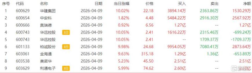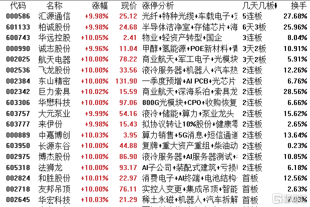 高位股方面,光纤概念(核心股)股汇源通信5连板,柏诚股份6天3板,华远控股3连板。诚志股份、航天电器3天2板,飞龙股份、东山精密、巨力索具等2连板。