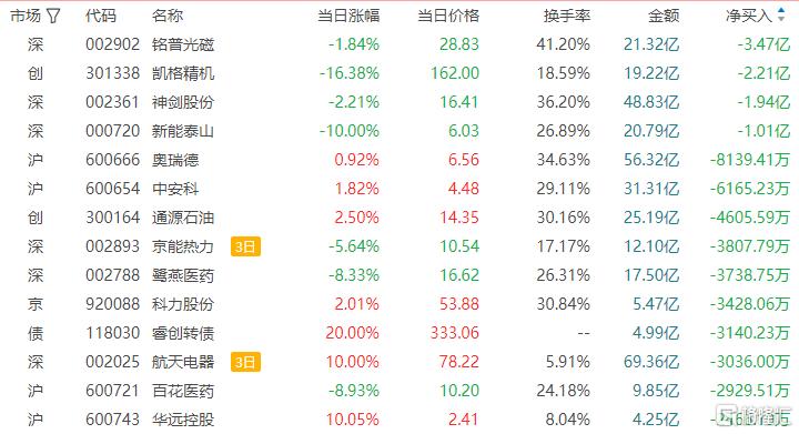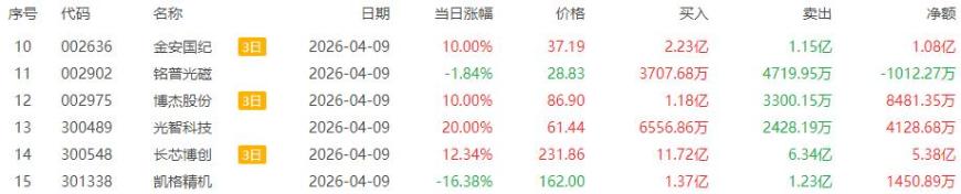 龙虎榜单日净卖出额前三为铭普光磁、凯格精机、神剑股份,分别为3.47亿元、2.21亿元、1.94亿元。