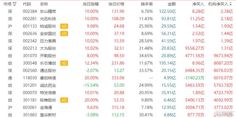 龙虎榜中涉及机构专用席位的个股中,当日净买入额前三为东山精密、光迅科技、巨力索具,分别为2.38亿元、2.18亿元、1.39亿元。