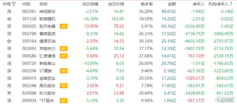 龙虎榜中涉及机构专用席位的个股中,当日净卖出额前三为神剑股份、凯格精机、鹭燕医药(核心股),分别为2.14亿元、2.02亿元、3896.09万元。