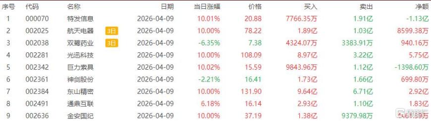 成都系:净买入特发信息9985万元;净卖出铭普光磁5049万元、奥瑞德8327万元